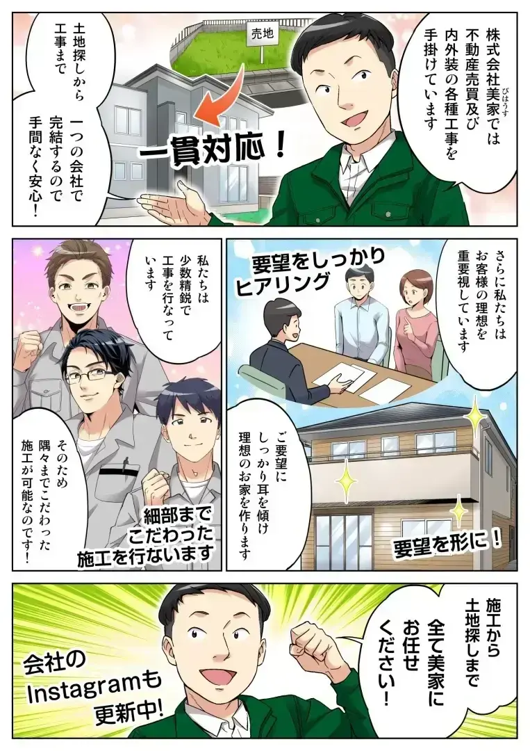 美家では、理想の住まいを手に入れるためのヒアリングに力を入れています。ヒアリングの中で要望をくみ取り、実現するためのご提案を行っております。また、施工でも細かい部分までこだわることで、美しい仕上がりでご提供することが可能です。