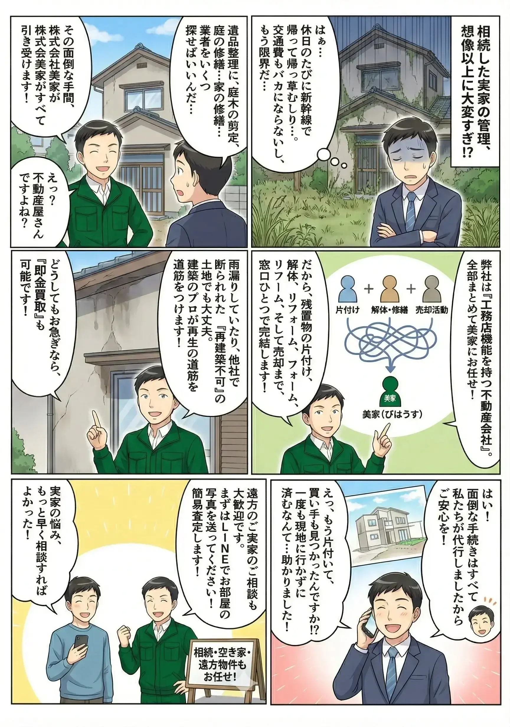 株式会社美家では通常の不動産売買だけでなく、自社でリノベーションを行い価値を上げた不動産の売却や相続、ローンの相談など様々なご対応を行うことが出来ます。